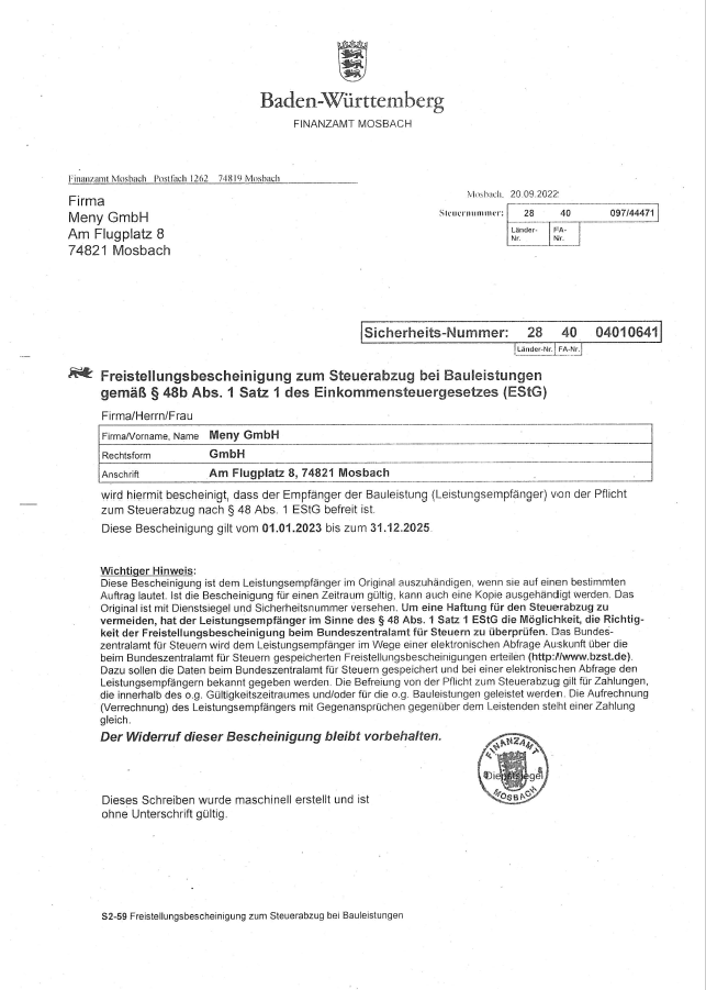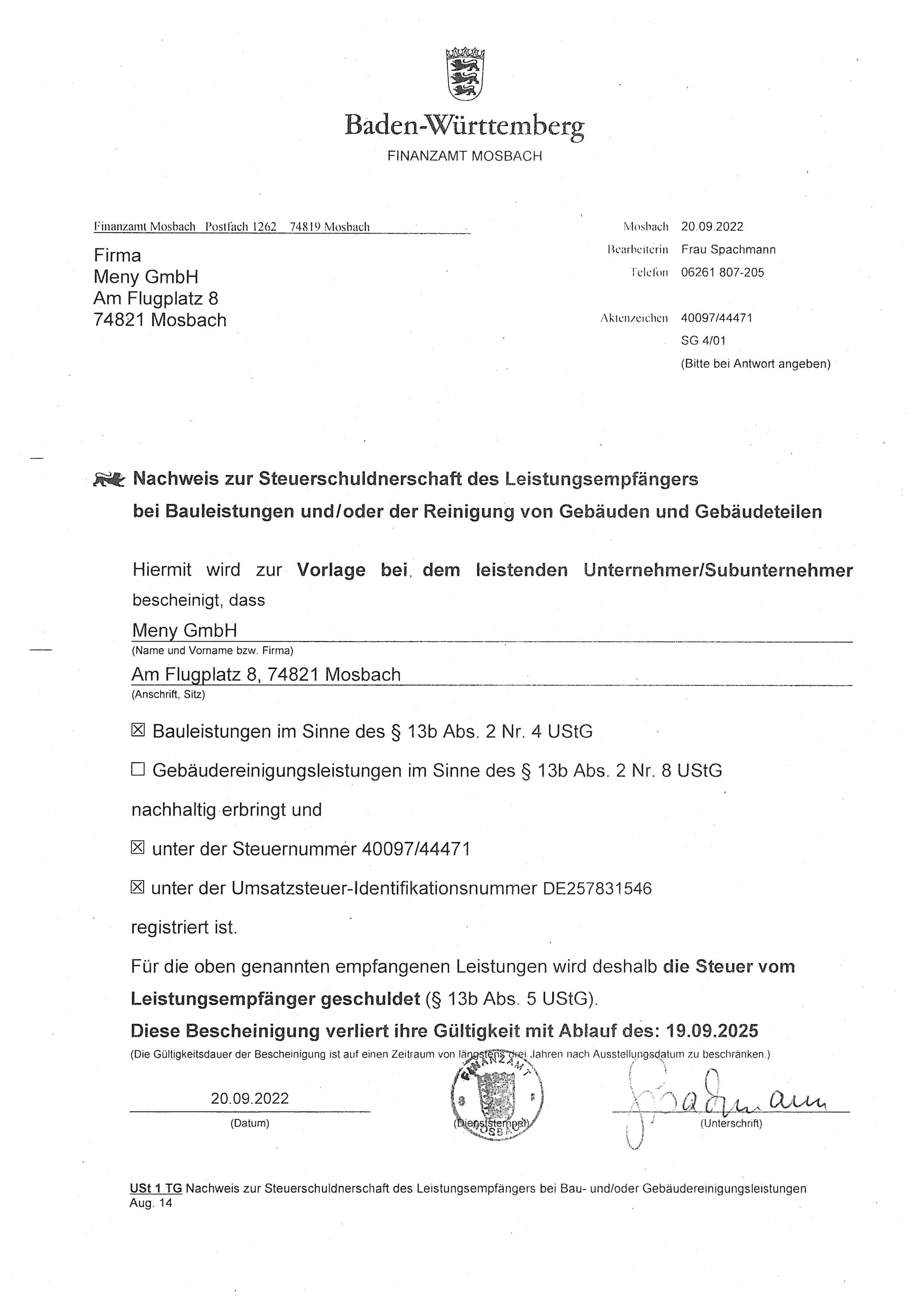 Nachweis Steuerschuldnerschaft Bauleistungen